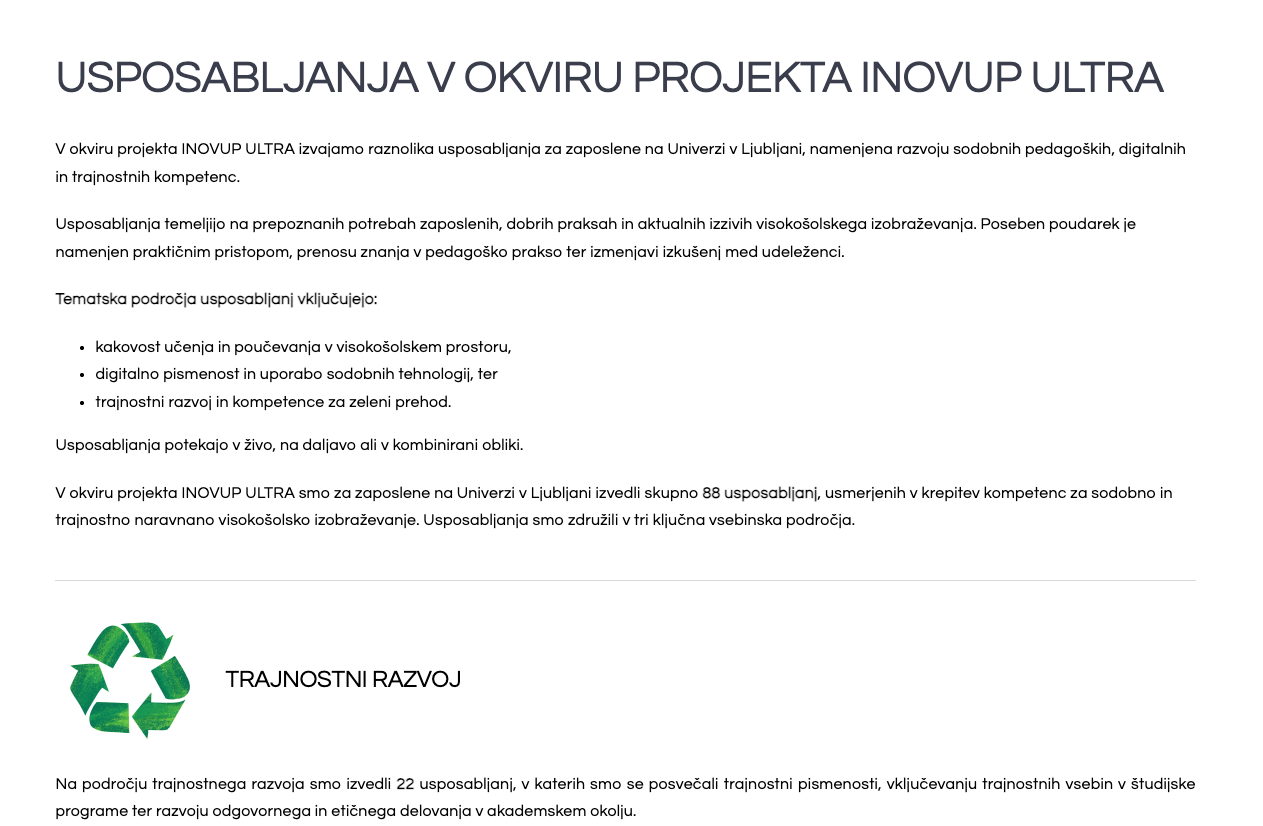 INOVUP ULTRA je projekt Univerze v Ljubljani, namenjen razvoju kakovostnega, sodobnega in trajnostno naravnanega visokošolskega poučevanja. Z usposabljanji in podporo zaposlenim krepi kompetence za izzive družbe prihodnosti.